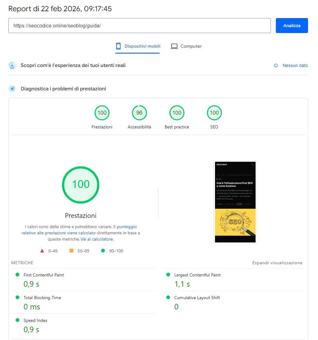Il 22 febbraio 2026 abbiamo pubblicato il primo articolo su SEOCodice e — prima ancora di promuoverlo — abbiamo aperto PageSpeed Insights. Il punteggio era 91/100 su mobile. Per un blog appena nato, già un risultato straordinario. Ma non era abbastanza: l’obiettivo era dimostrare che un WordPress costruito con la metodologia Infrastructure-First SEO può competere con qualsiasi framework statico. Questo è il diario tecnico di come siamo arrivati a 100/100 in meno di 24 ore, senza plugin di cache, senza CDN, senza magie.
